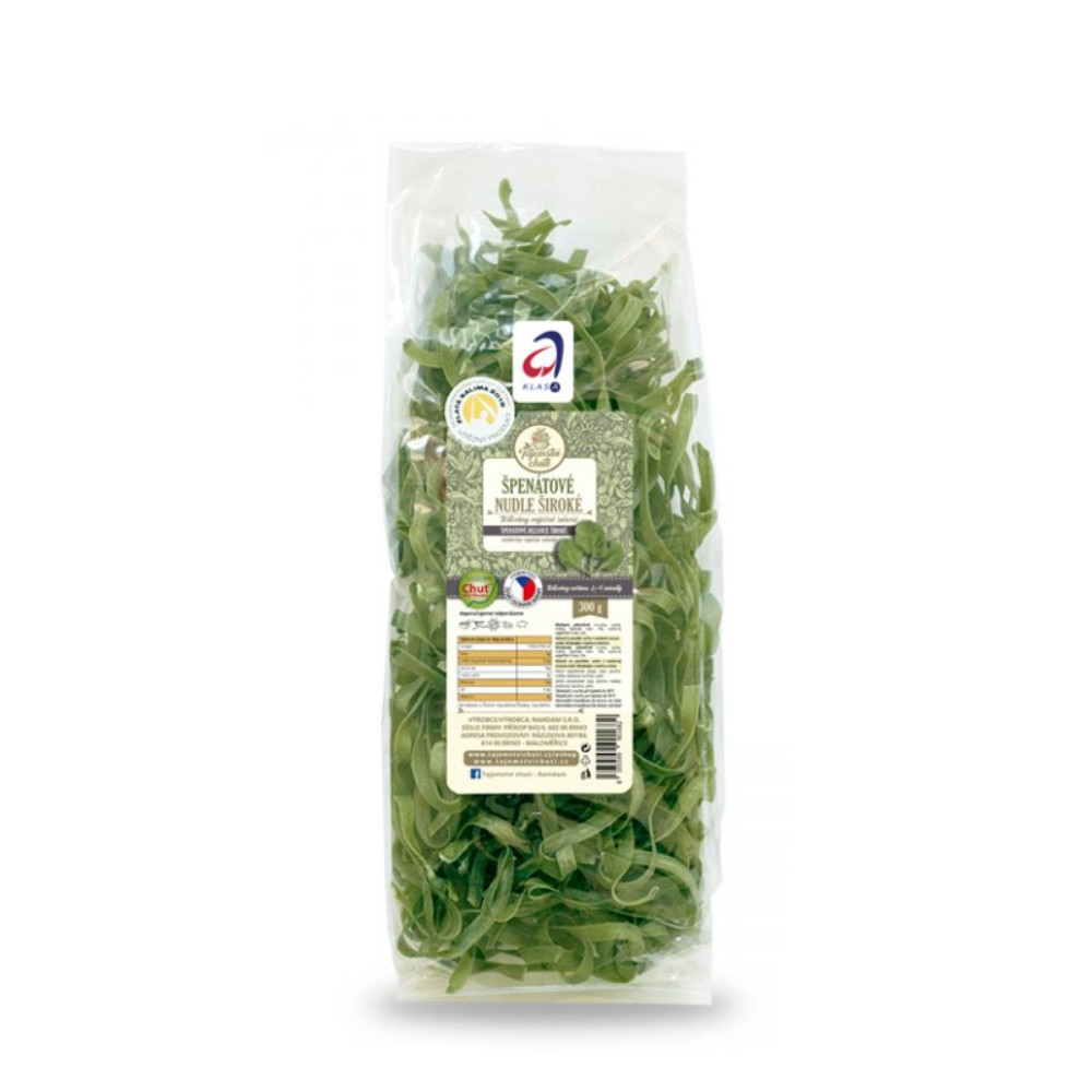 Složení: Pšeničná mouka, voda, mletý špenát min. 3%, sušená vaječná směs 2%